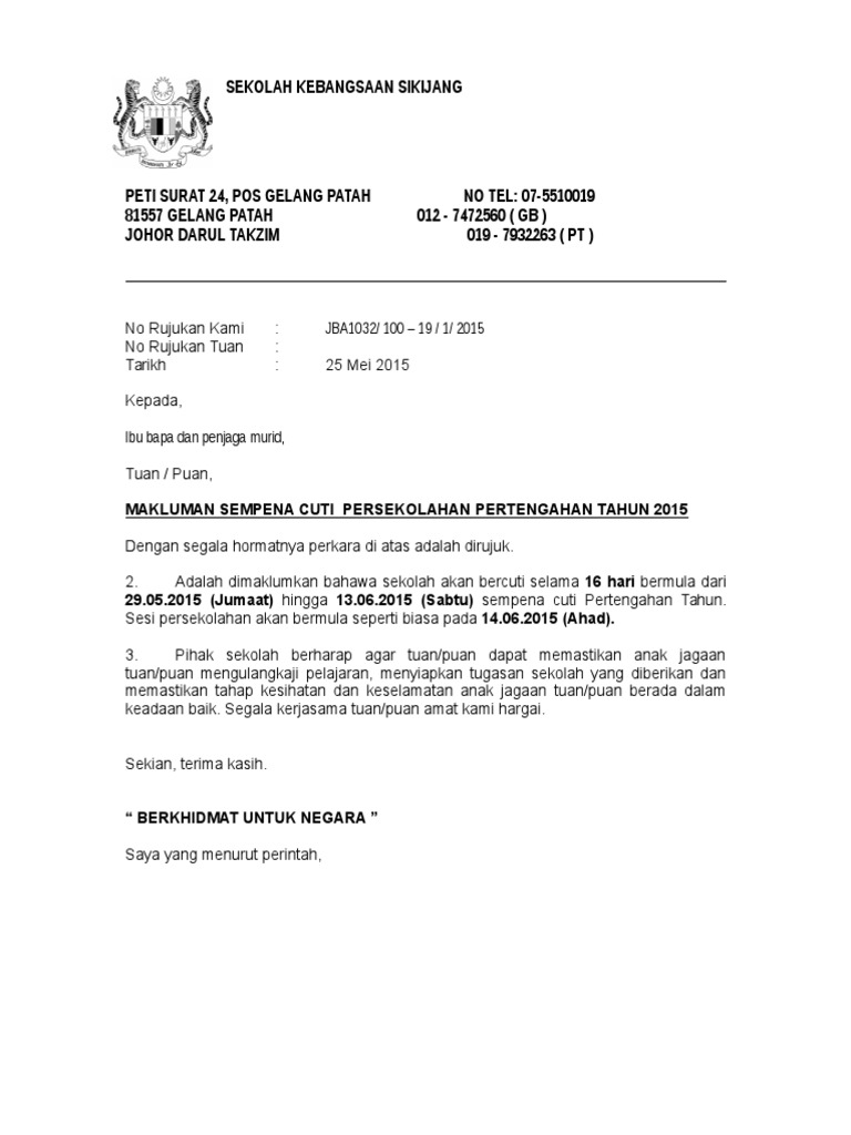 Surat peringatan bayaran yuran pibg doc. Surat makluman kepada ibu bapa dan murid berhubung cuti pertengahan tahun dan cuti sempena perayaan aidilfitri 2019. Set 1 boleh digunakan.